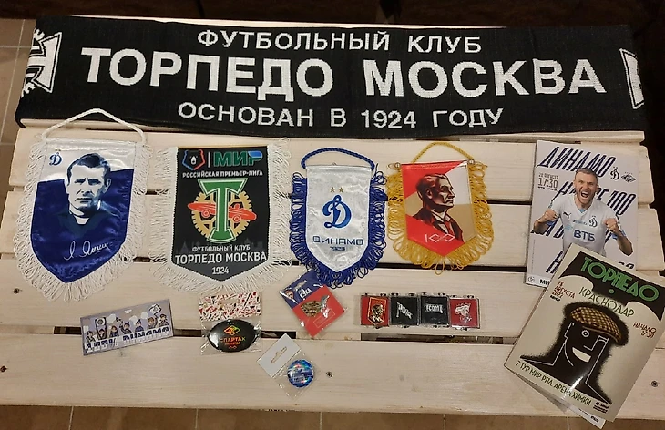 Выезд получился насыщенным, мне удалось посетить два матча: Динамо 1:0 Спартак и Торпедо 1:4 Краснодар. Обзор на данные матчи Вы можете прочитать в нашем блоге. Помимо этого, я побывал в фан-шопах Спартака и ЦСКА. Все привезенное добро вы можете увидеть на общем фото выше.