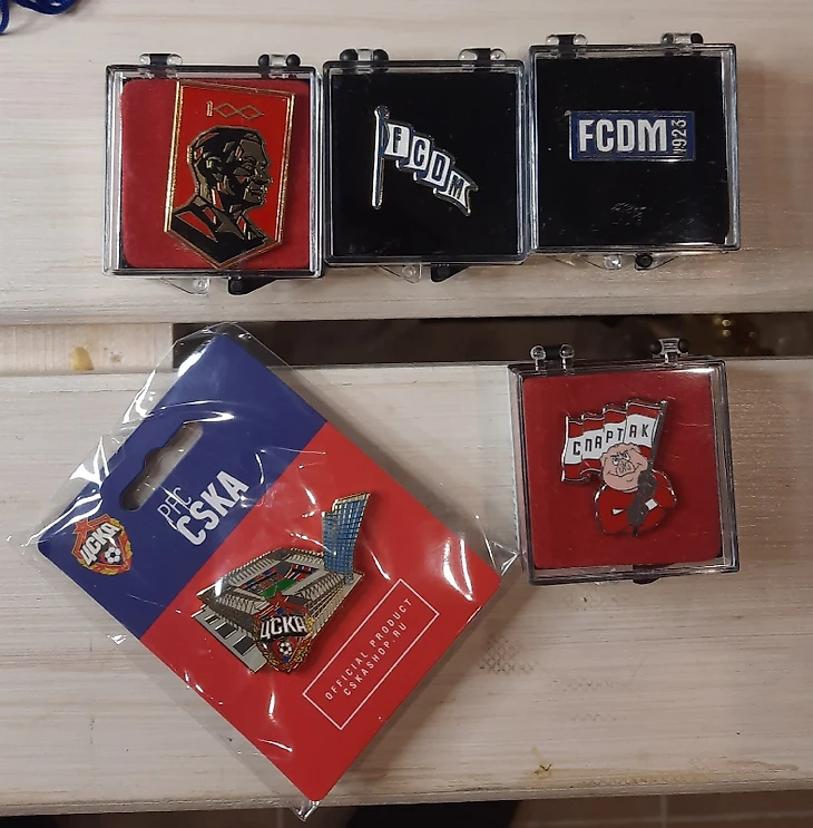 Коллекция пополнилась пятью знаками на креплении цанга. Два знака в виде флага и надписи связанных с ФК "Динамо" были приобретены непосредственно на стадионе, во время матча против "Спартака". Знак с изображение "ВЭБ Арены", где играют московские армейцы был приобретен в официальном магазине. Сам фан-шоп оставил приятные впечатления. Два других знака в виде вымпела с изображением Старостина Н.П. и хрюшки с флагом "Спартака" были приобретены в официальном магазине на стадионе "Открытие Банк Арена". Если сравнивать фан-шоп "ЦСКА" и "Спартака", то красно-белые тут явные фавориты. Единственная сложность, это нахождение магазина. Фан-шоп расположен в чаще стадиона и для того, что бы в него попасть, необходимо пройти досмотр перед проходом на территорию стадиона.