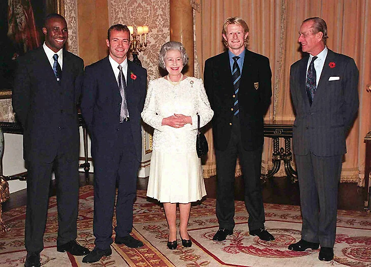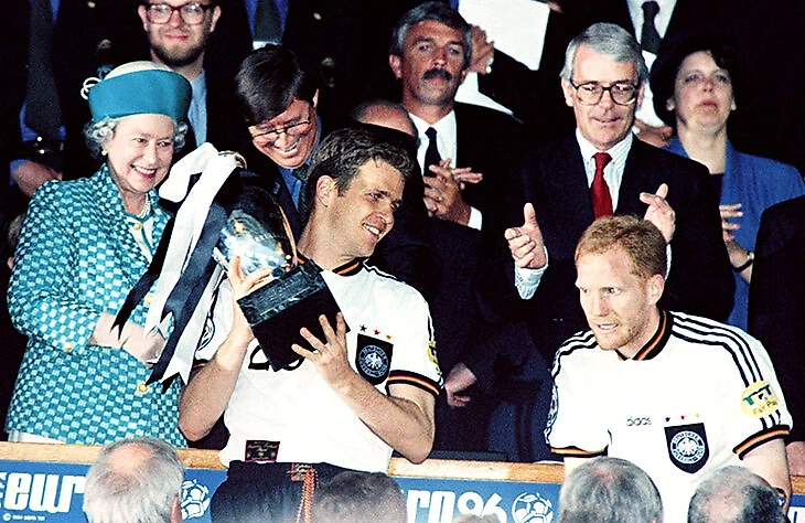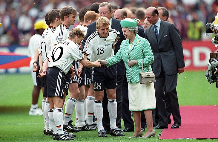 Голову перед Королевой склонил Томас Хесслер и Юрген Клинсманн. Это 1996-й, финал Евро на «Уэмбли».