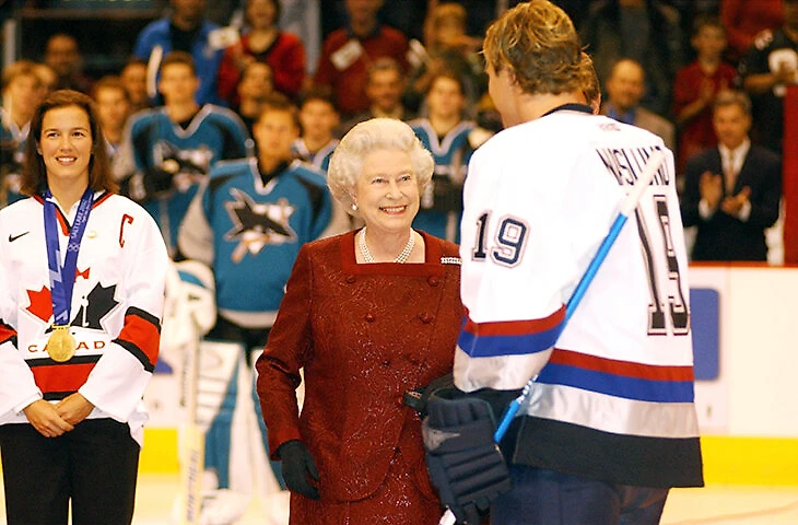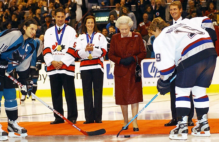 Ванкувер, 6 октября 2002-го. Королева вышла на лед перед выставочным матчем НХЛ под руку с королем игры – Уэйном Гретцки. Хоккеисты «Ванкувера» и «Сан-Хосе» поучаствовали в самом торжественном вбрасывании шайбы в истории хоккея.