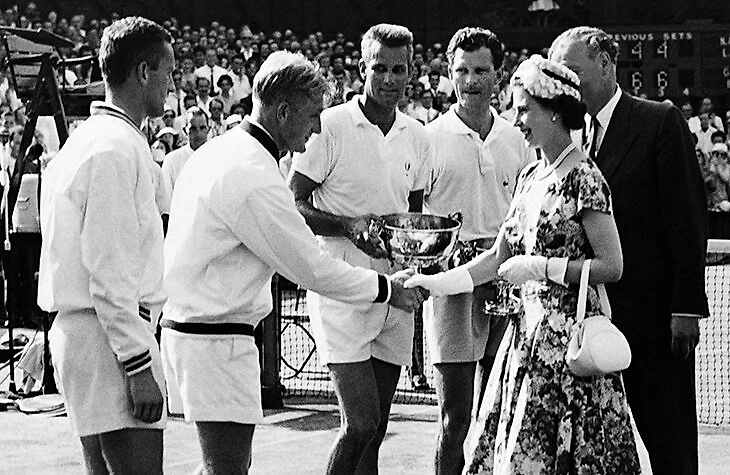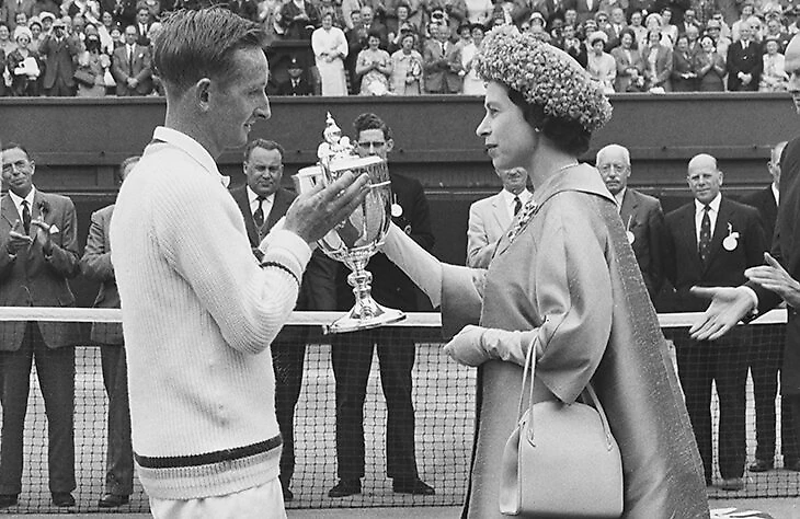 Снова теннис. Австралиец Род Лэйвер получает из рук монаршей особы трофей (1962).