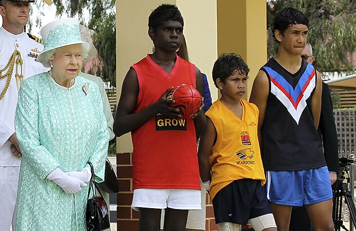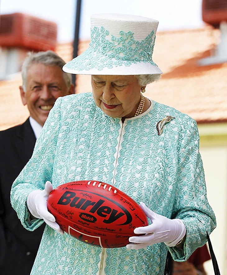 Перт, октябрь 2011-го. Королева сначала наблюдает за игрой, а затем держит в руках мяч для австралийского футбола.