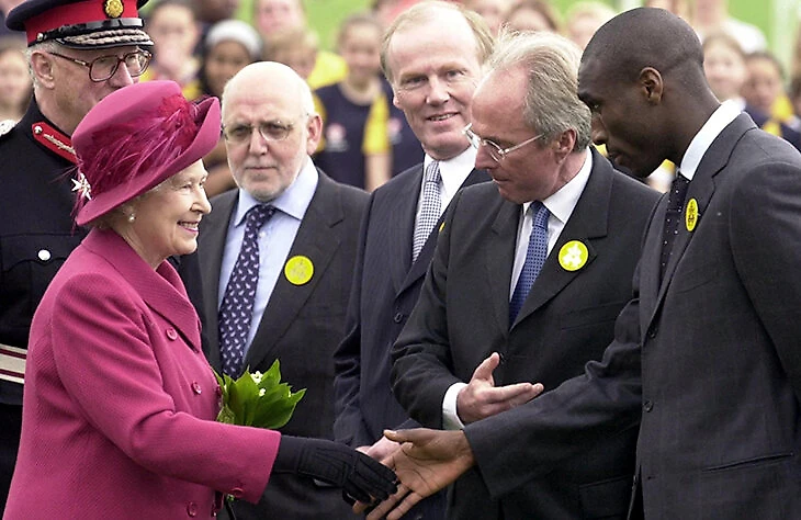 2002-й, Елизавета II рядом с Солом Кэмпбеллом и Свеном-Йораном Эрикссоном.