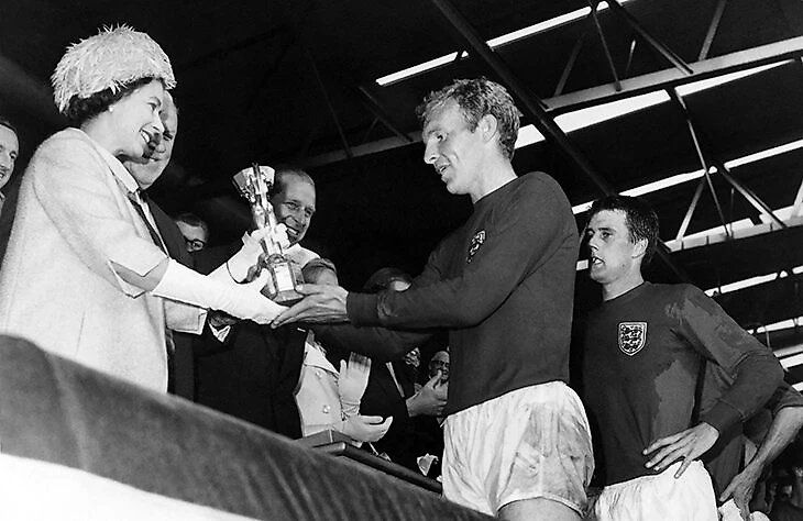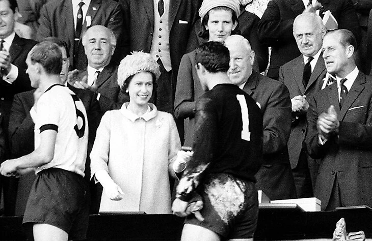 Момент славы для сборной Англии. Кубок Жюля Риме переходит из рук Елизаветы II к капитану англичан Бобби Муру. За ним – герой финала и автор хет-трика Джефф Херст.