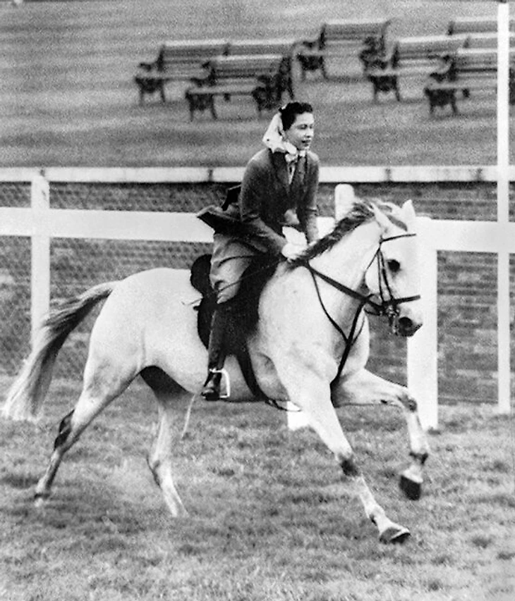 Уже королева Елизавета II участвует в верховом выступлении для гостей Виндзорского замка, 1961 год. Тогда Елизавета пришла к финишу 7-й из 10.