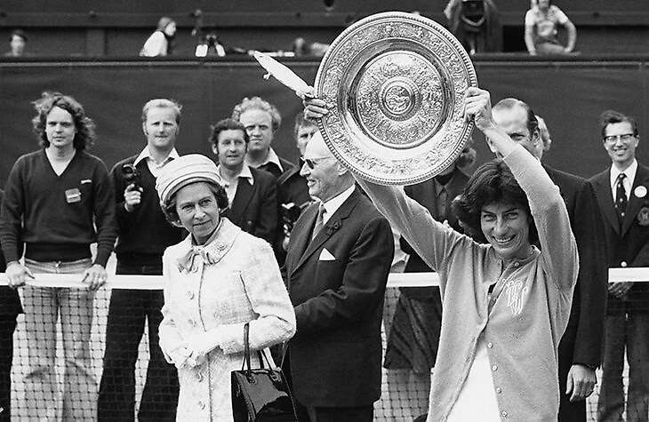 Британская теннисистка Вирджиния Уэйд делит с Королевой радость победы над Бетти Стове из Нидерландов. Центральный корт «Уимблдона», 1 июля 1977-го.
