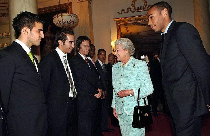 Тьерри Анри представляет монарху игроков «Арсенала» – Франсеска Фабрегаса, Матье Фламини, Томаша Росицкого, Джастина Хойта, Тео Уолкотта и Фредди Юнберга. Встреча прошла в феврале 2007-го и была организована после того, как Королева из-за болей в спине пропустила открытие нового клубного стадиона.