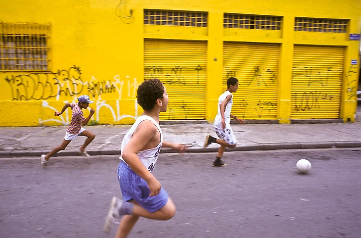 Мальчики играют в футбол на улицах Сан-Паулу. Бразилия, 1998 год.