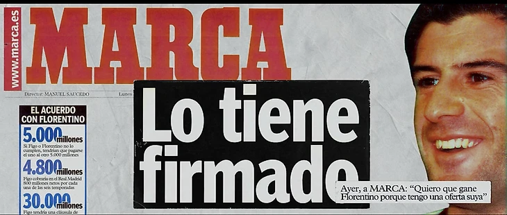 Marca пошла дальше и бахнула инсайд о том, что Вейга подписал с Пересом предварительный контракт о переходе в «Реал», если Флорентино станет президентом. Говорят, что именно он стал ключевым фактором трансфера Фигу.