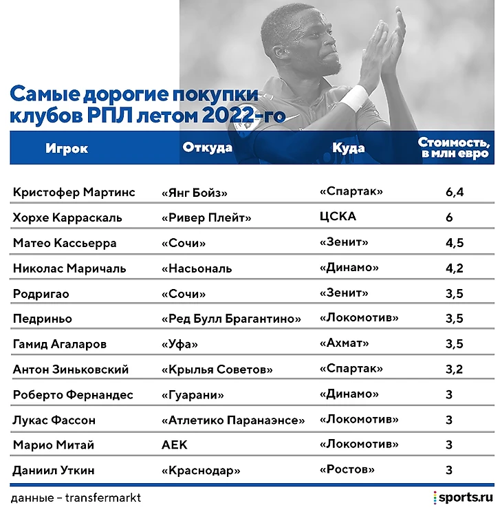 8. Еще один тренд – выкуп игроков после аренд. ЦСКА договорился с Хорхе Карраскалем, «Спартак» – с Кристофером Мартинсом, «Ахмат» – с Дарко Тодоровичем, «Крылья» – с Максимом Глушенковым и Матео Барачем, «Ростов» – с Николаем Комличенко, «Урал» – с Лео Гогличидзе.