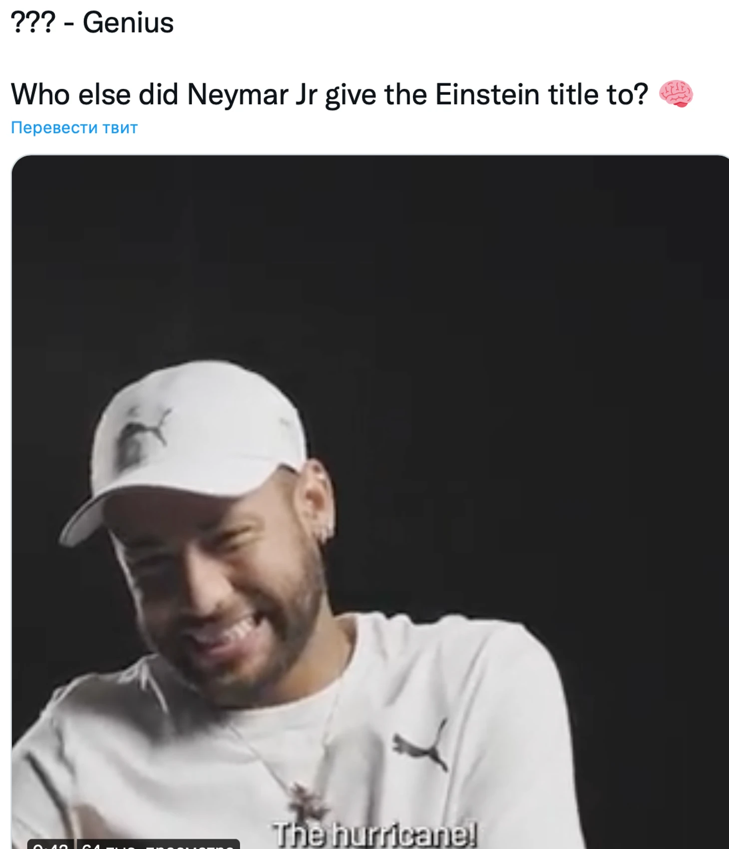 Неймар сказал: «Харри Кейн? Ураган (прим. ураган на английском – hurricane), хаха. Одним словом... гениальный. Гениальный!». Бразилец отметил игровой интеллект нападающего шпор.