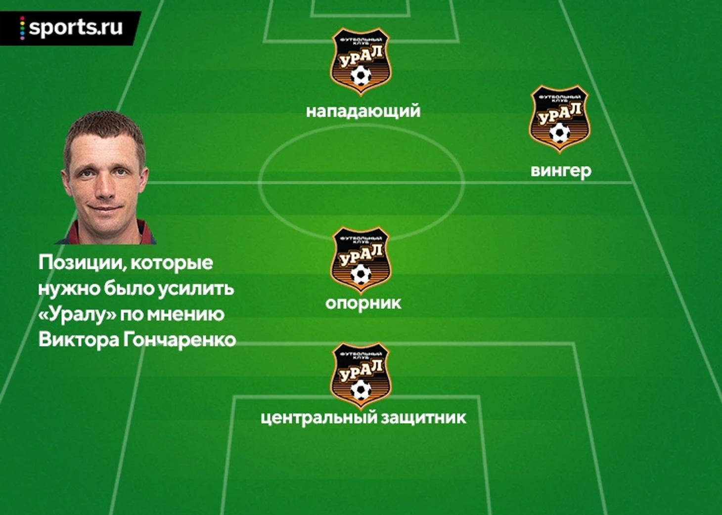 В середине августа новым главным тренером «Урала» стал Виктор Гончаренко. Он сразу обозначил четыре позиции, требующие усиления – центральный защитник, опорник, крайний полузащитник и центральный нападающий.