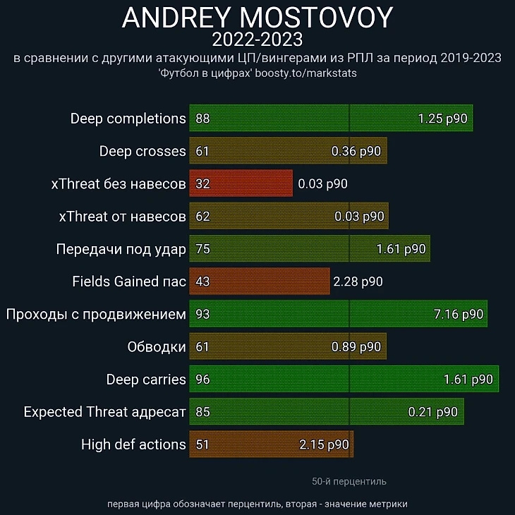 Статистика Мостового действительно впечатляет. Ниже – его цифры на старте чемпионата в сравнении с другими вингерами лиги за последние четыре сезона. Первая цифра означает перцентиль. Чем показатель выше, тем выше игрок в группе наблюдения. Особенно выделяются проходы в радиус штрафной (deep carries) – по этому показателю он сильнее 96% атакующих игроков за четыре года.