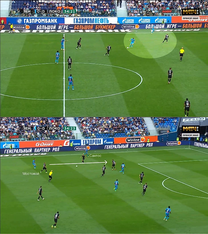 Например, в игре с «Локо» Мостовой нашел пространство через два рывка (сначала поднялся и отыгрался с партнером, затем спустился и стянул на себя двоих), после чего отыграл назад под взаимодействие Сантоса и Вендела.