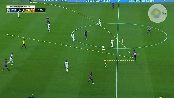 На этом примере восемь человек отрезаны от обороны, и на Рональда Араухо ложится огромная ответственность.