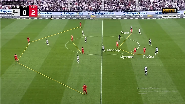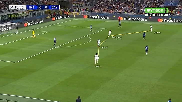 В атаке могут выходить разные футболисты. Выбор очень большой (Мюллер, Мане, Сане, Коман, Гнабри, Мусиала, Тель, Шупо-Мотинг), но неизменными остаются гибкость и вариативность.