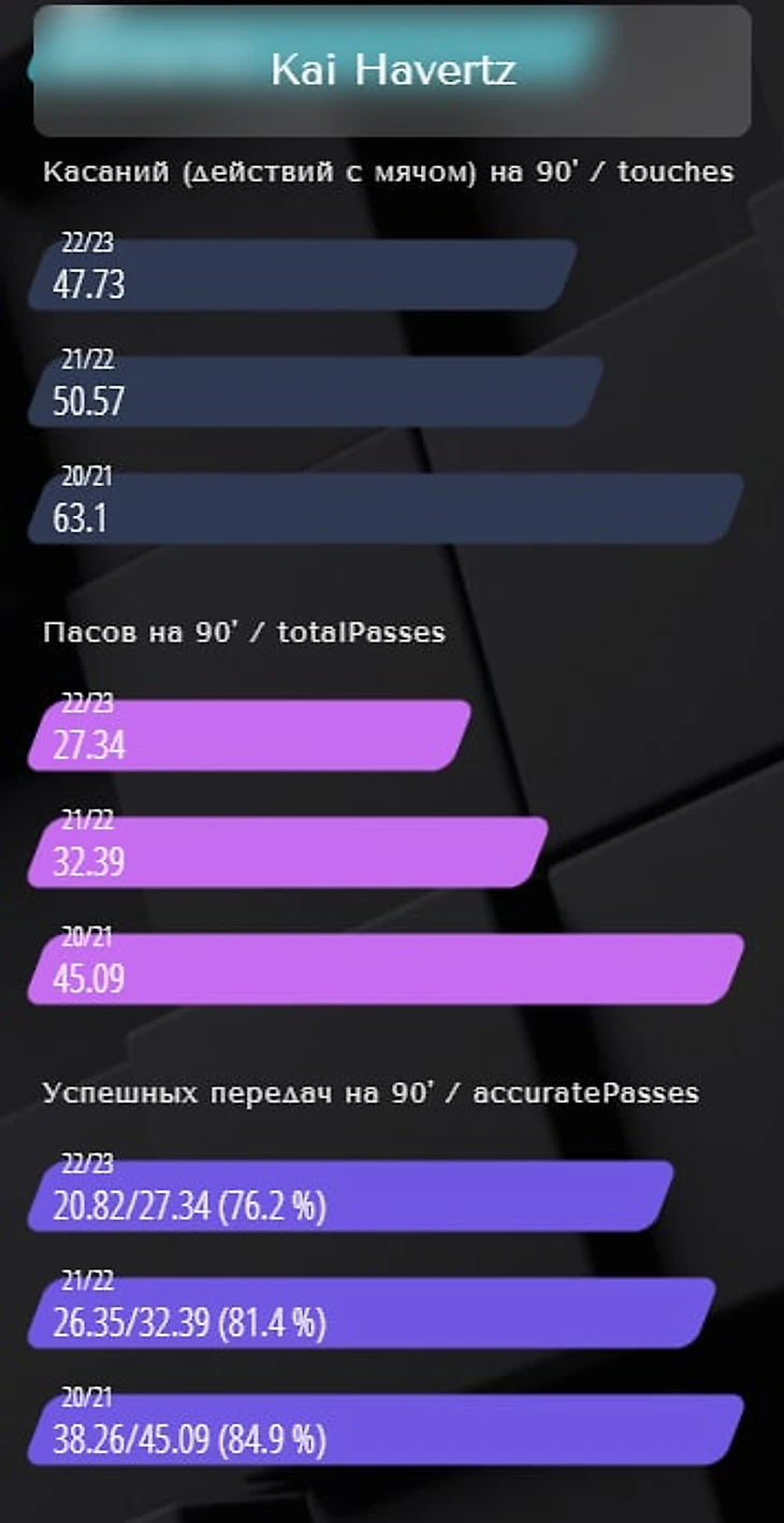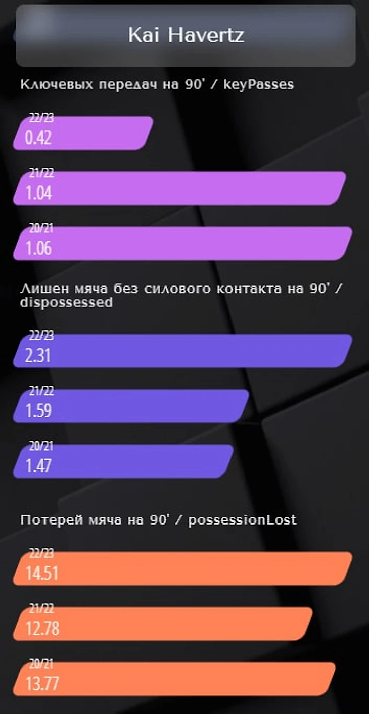 Но я всё же скажу: Хавертц – это смесь ультра деревянного и супер мега ужасного игрока прямо сейчас. Вот, например, инфографика моей web-программы по Хавертцу в сравнении с его же показателями за последние три сезона: