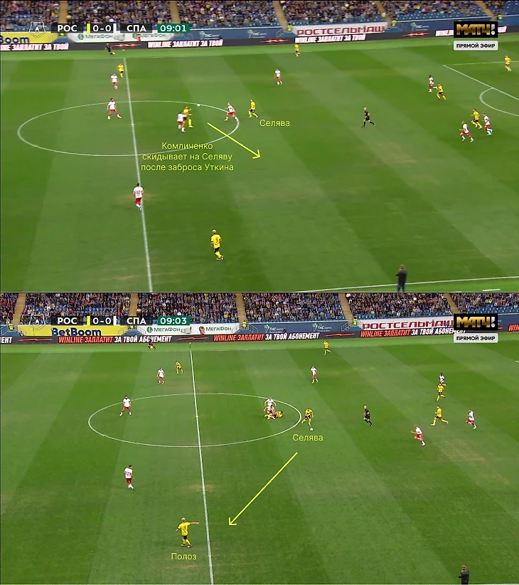 Еще через несколько минут «Ростов» снова переиграл «Спартак». В этот раз уже на подборе – хозяева выиграли борьбу, отрезали Умярова, Селява мог запустить Полоза в опасный проход (кстати, эпизод закончился передачей назад и еще одним привозом).