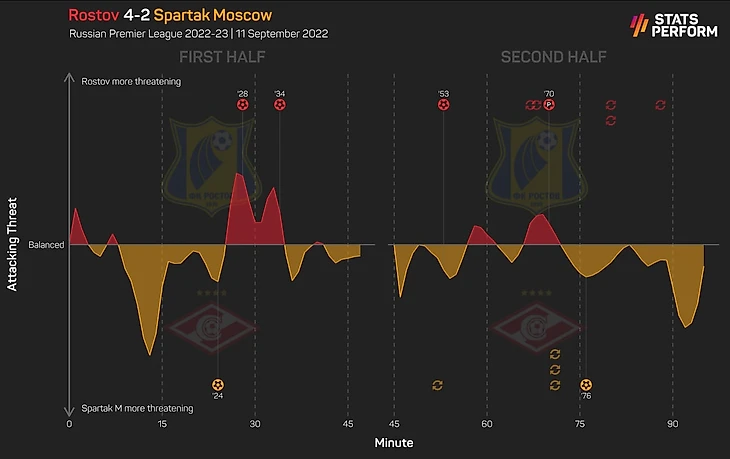 В первые 20 минут действительно были интересные идеи по прессингу и фланговой игре. Ниже – график от Opta, показывающий распределение атакующей опасности. До гола Промеса «Спартак» был острее, после чего наступил этап с инициативой «Ростова». Во втором тайме гости сами подарили моменты, которые частично вытекали из проблем первой половины матча.