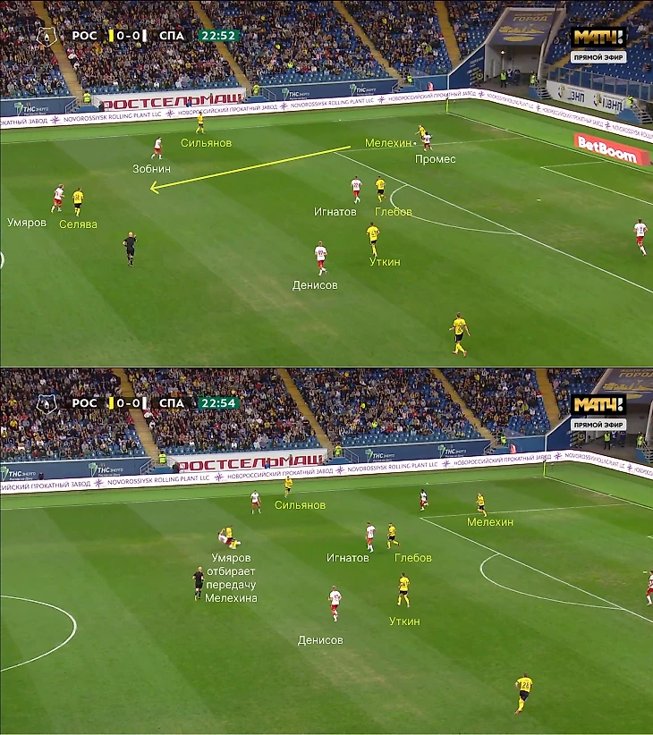 Гол Промеса – результат фланговой подачи после успешного прессинга, когда Тугарев и Селява ориентировались на Умярова, а Зобнин уводил Сильянова к штрафной, чтобы освободить пространство для подключения. В итоге «Спартак» воспользовался ошибкой и открыл счет.