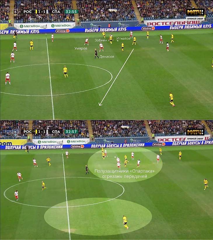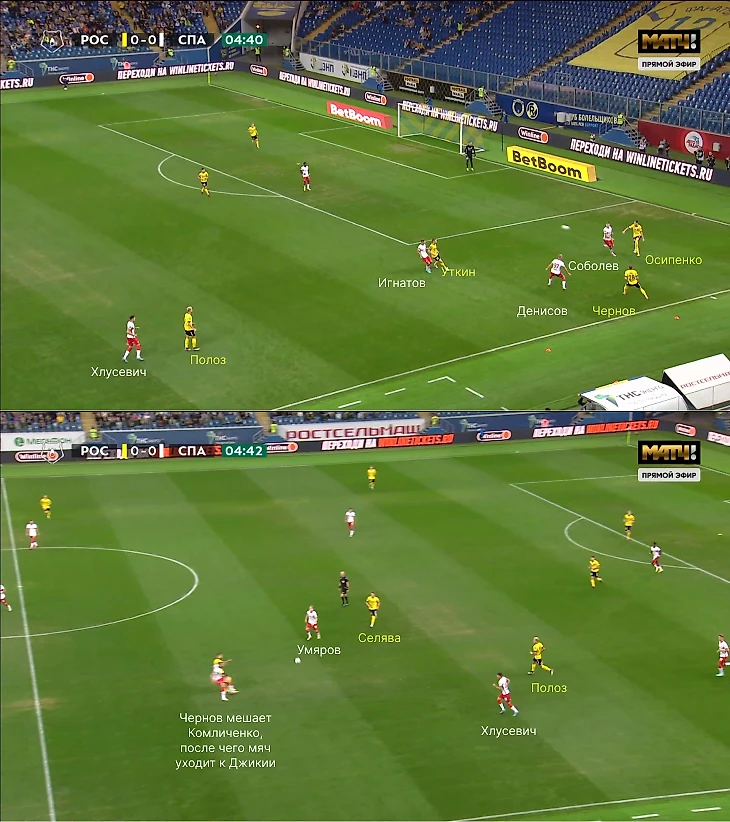 «Ростов» тоже прессинговал (и даже придумал интересный вариант, когда Евгений Чернов приходил в опорную зону за Денисовым), но часто откатывался назад в компактный блок (Глебов садился пятым защитником). Такая тактика сильно усложняла игру «Динамо» (1:1) и ЦСКА (0:0), но «Спартак» неплохо подготовился через насыщение флангов и высокие подключения центральных защитников.