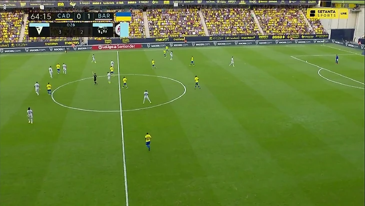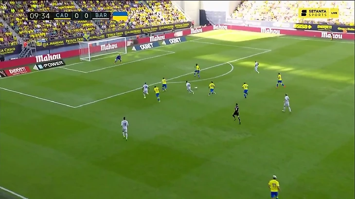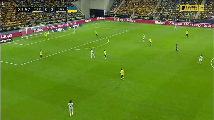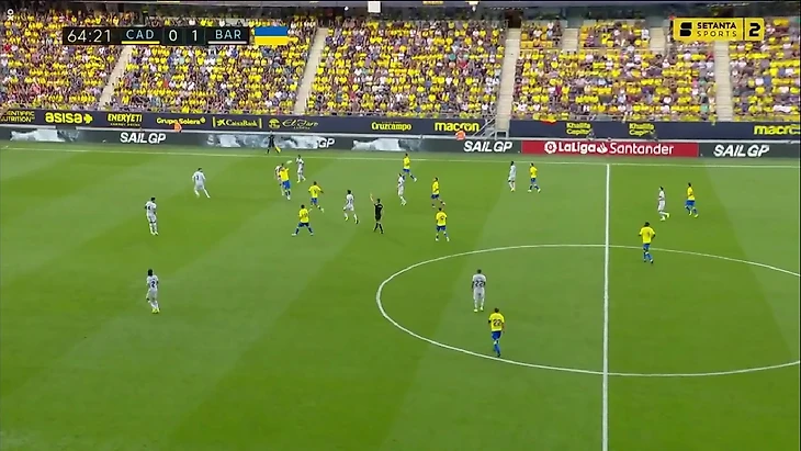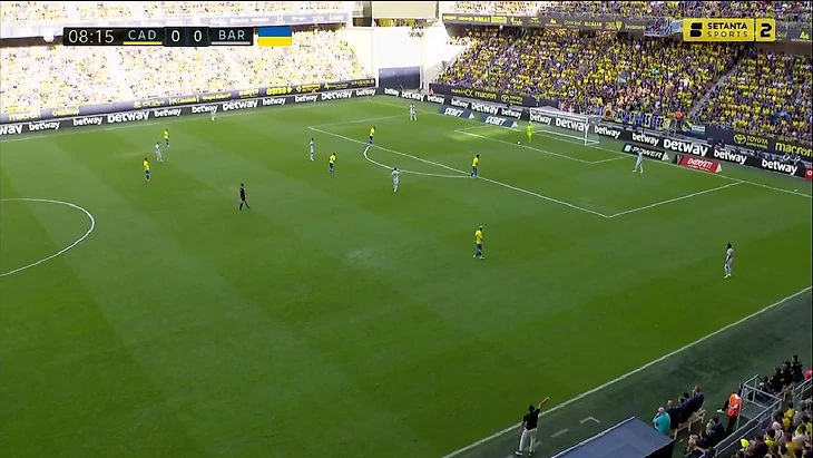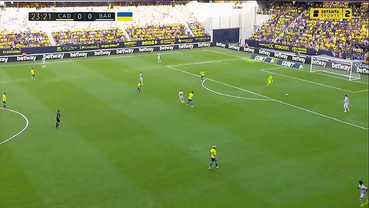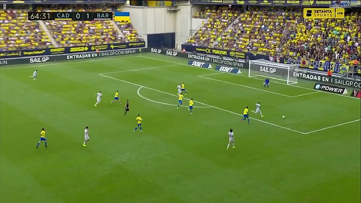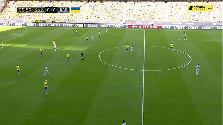 Отрезок действительно был мощный: «Барселона» была вынуждена выбивать мяч вперёд, «Кадис» выигрывал подбор за подбором и накатывал волнами на ворота гостей, но есть одна проблема. Этот отрезок не продлился и трёх минут, и как только Дембеле получил свободу, он тут же шикарным пасом отправил Левандовского на рандеву с Ледесмой: