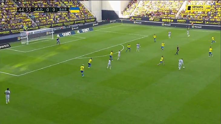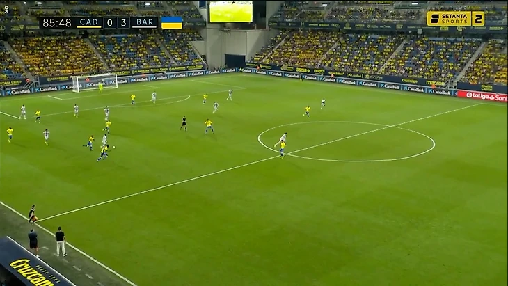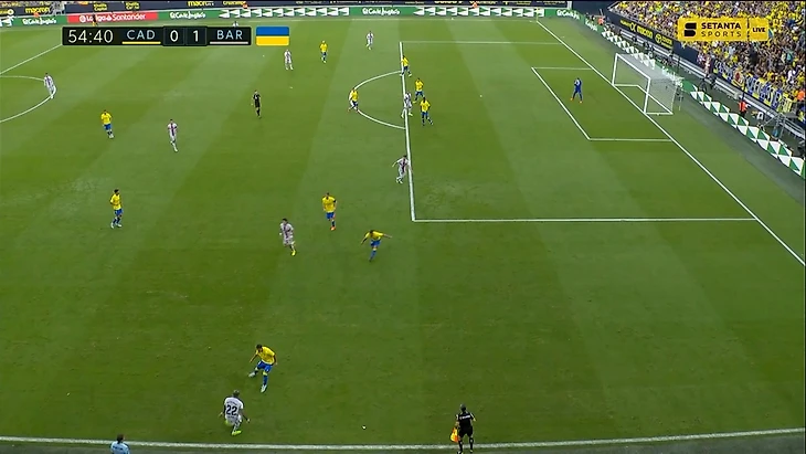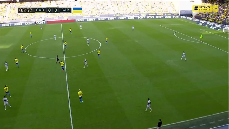 Ещё один пример с полезной диагональю. У «Кадиса» образовалась ситуативная пятёрка сзади, но пространство справа есть и там свободны Рафинья и Бельерин: