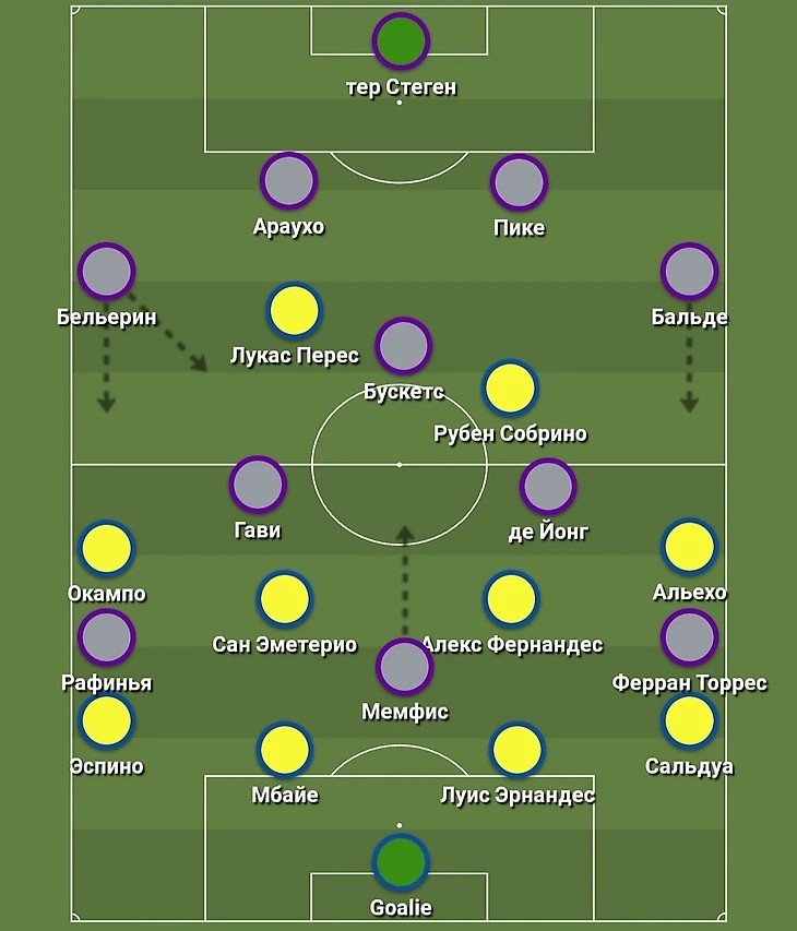 В составе «Барселоны» ожидаемо произошли серьёзные изменения. У команды во вторник состоится важнейший матч с «Баварией», поэтому на эту игру вышел изменённый состав: Ферран Торрес, Рафинья, де Йонг, Бельерин и Мемфис в старте; и Левандовский, Дембеле, Педри, Кунде и Ансу Фати на скамейке. Схема 4-3-3, с Мемфисом в роли «ложной девятки».