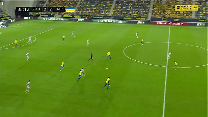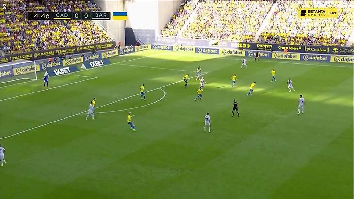 Так как прессинг «Кадиса» абсолютно не работал, а «Барса» здорово контр-прессинговала на чужой половине поля, у хозяев вообще никаких шансов на моменты с контратак не было. По сути, единственным способом для «Кадиса» создать хоть какую-то напряжённость у ворот гостей – стандарты (в том числе и ауты, с которых Луис Эрнандес забрасывал мяч в штрафную). Всего за матч «Кадис» нанёс 6 ударов по воротам тер Стегена, из них 4 со стандартов.