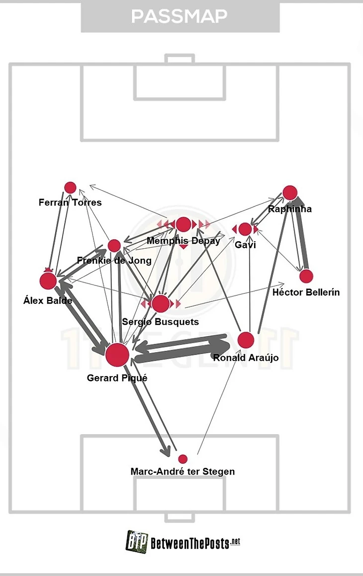 Переводы с фланга на фланг «Барса» Хави эксплуатирует давно, схема простая: соперник стягивается ближе к флангу, где происходит розыгрыш мяча, и в определённый момент команда переводит мяч на другой фланг, так как там больше пространства. Обычно, в матчах «Барсы» это работает по чёткому распределению: левый фланг для комбинаций, а правый для изоляций. Именно поэтому Усман Дембеле так прибавил при Хави – француз просто разрывает в ситуациях 1-в-1. В этом матче играл Рафинья, который по качествам похож на Дембеле, однако конкретно в этой игре нельзя сказать, что «Барселона» активно использовала изоляции справа. Да, бразилец держал ширину, но в этом матче, мы скорее видели комбинации справа, а не изоляции. С самого начала в этой зоне образовался треугольник Рафинья – Гави – Бельерин. Мы можем это увидеть по карте передач: самый частые адресаты передач Эктора – Гави и Рафинья (других особо и нет), а например у Бальде – Пике и де Йонг (голландец больше был задействован в розыгрыше мяча у своих ворот):