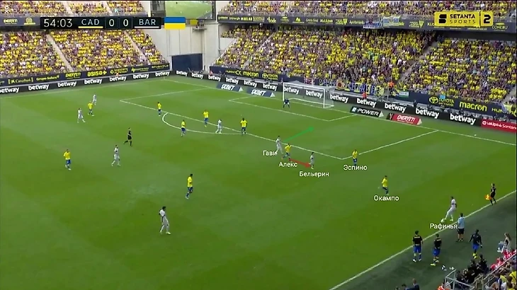 Обратите внимание на Бельерина и Алекса Фернандеса: у Эктора и так есть оппонент (Эспино), но Алекс зачем-то выдёргивается на фуллбэка «Барсы» и оставляет Гави свободным. Собственно, Рафинья увидел это и вырезал пас на Гави:
