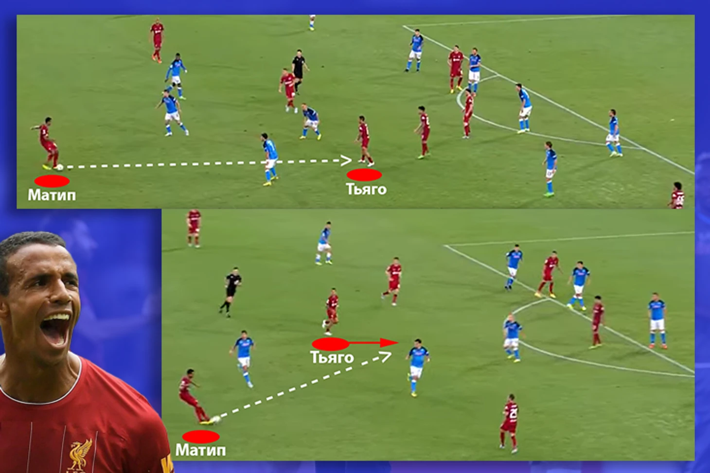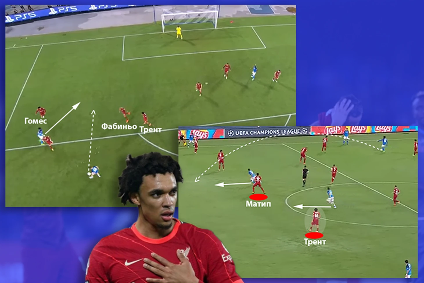 Например, на первой картинке неаполитанцы вскрыли оборону простой стеночкой, а во втором тайме (вроде бы уже вышел Матип, подстраховать не смог) Арнольд был очень расслаблен и не начинал движение в момент, когда шла передача за спину, поэтому он не успел заблокировать удар.