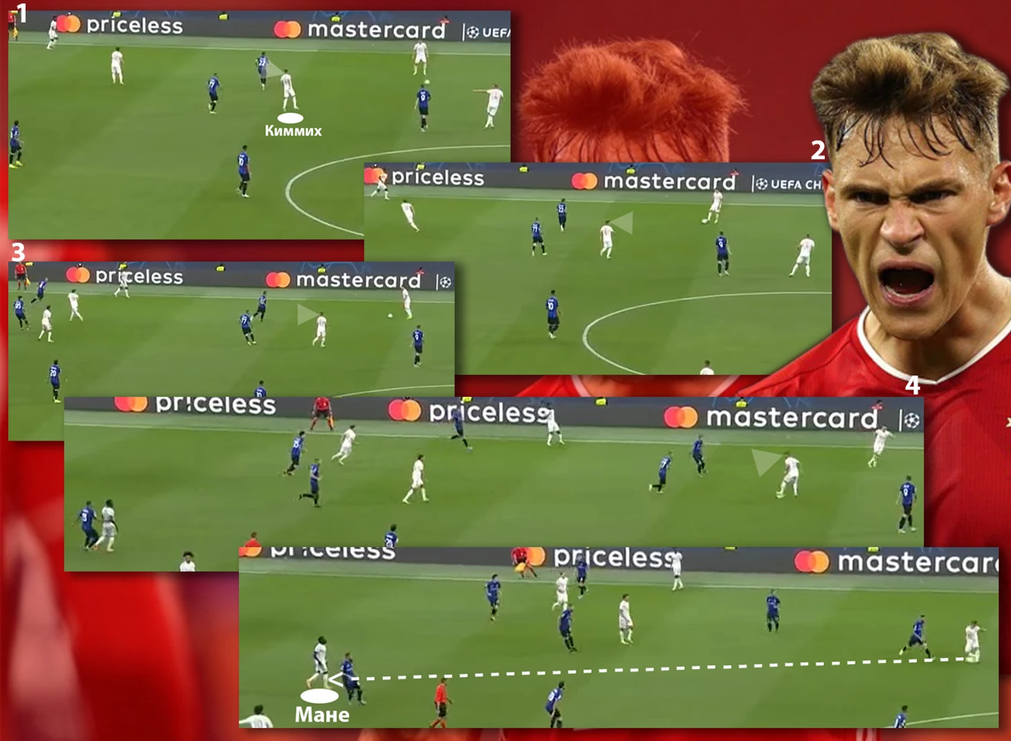 Второй пример показывает крутость Киммиха в сборе информации и ее интерпретации! Перед тем как получить передачу он три раза взглянул вокруг себя и в момент обработки мяча уже смотрел вперёд на возможного адресата. Именно с помощью сканирования пространства Иозуа смог вычислить позицию Мане. Передача от немца дойдет до Садио, и тот выкатит мяч под опасный удар Альфонсо Дэвиса!
