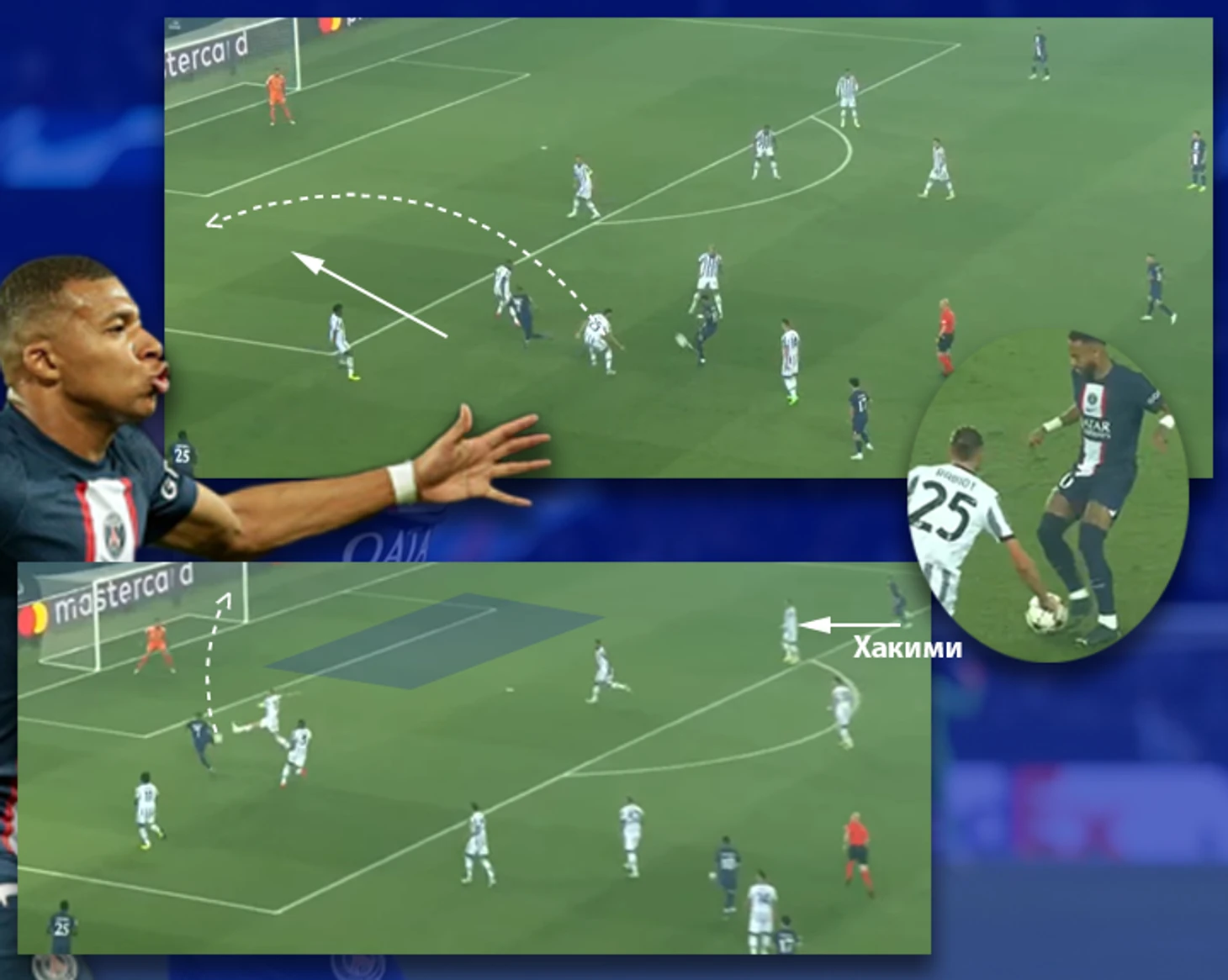 Хотя от игроков такого уровня всегда исходит давление. Например, первый гол Мбаппе был забит чисто благодаря индивидуальному мастерству (удар слета и черпачек) . Будь на месте Килиана не столь техничный футболист, здесь понадобился бы вариант с прострелом на дальнюю штангу, но как мы видим в штрафной был один француз. Намерения Хакими здесь бесполезны.