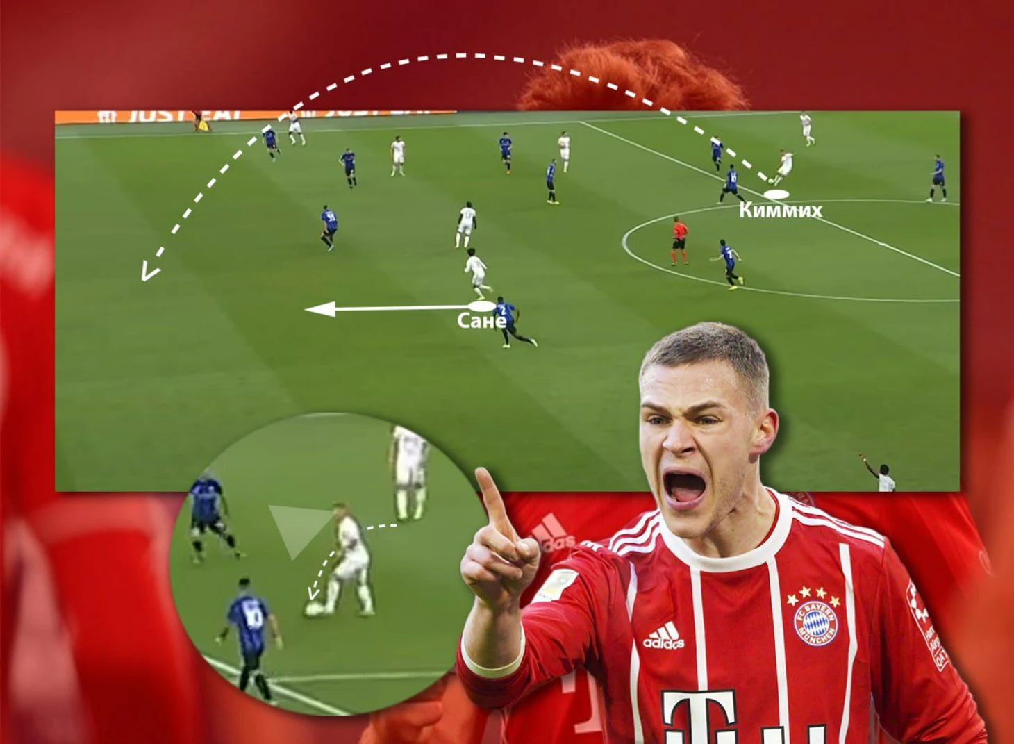 Хочу обратить ваше внимание на технику и сканирование пространства Йозуа. В моменте с голевой передачей он обработал мяч одним касанием, развернувшись почти на 180° (движение получилось слитным), сразу устремил свой взгляд на забегающего Сане и вторым касанием выполнил идеальный заброс!