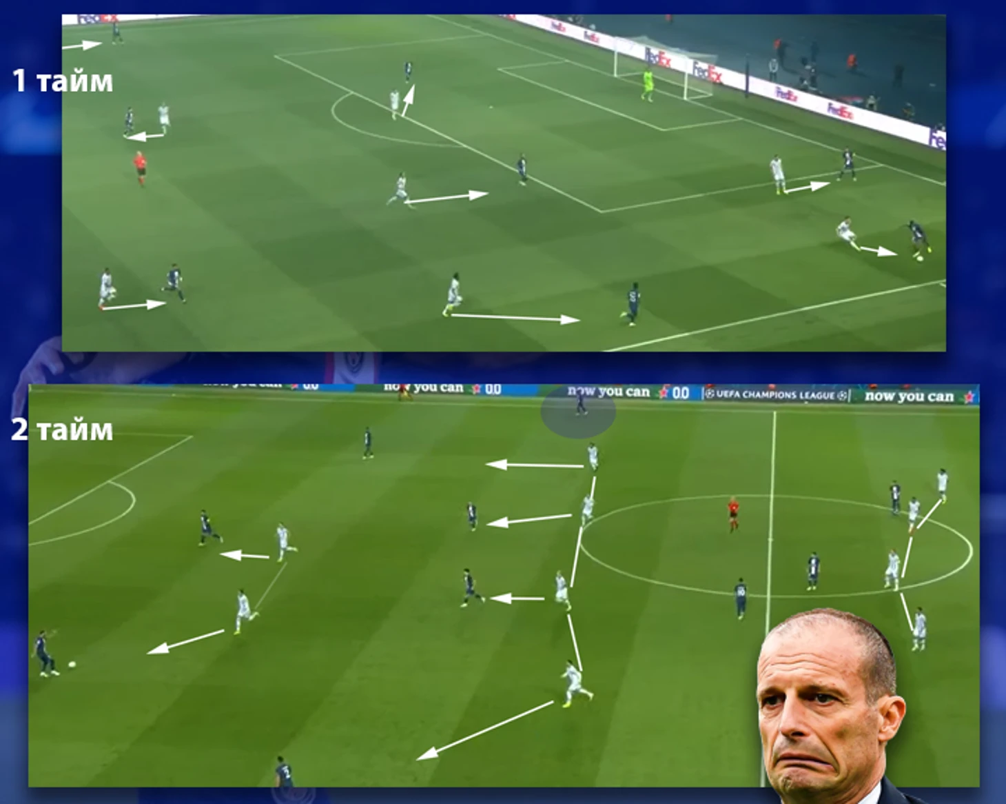 К началу второго тайма у ПСЖ было преимущество в два мяча, Юве нужно было забивать голы, и Аллегри решил видоизменить прессинг, но изменить прессинг в сторону надежности! В первом тайме Ювентус использовал персональный прессинг, Куадрадо дорабытывал до конца, но уже во втором тайме команда перешла на схему 4-4-2! По такой схеме у Парижа оставался свободный игрок на дальнем от мяча фланге, но зато у них не было преимущества в атакующей линии. Куадрадо уже не шел в высокий прессинг, а создавал 4v3 в центре поля.