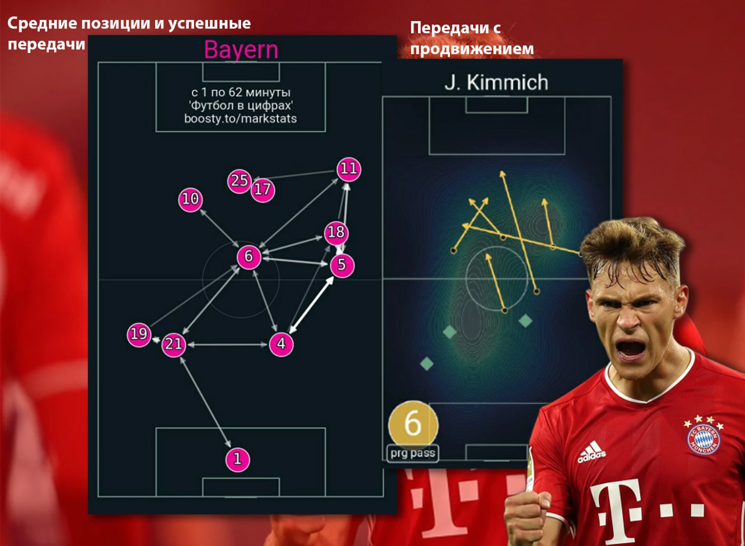 Йозуа Киммих против Интера виртуозно диктовал темп игры, а также дирижировал мячом из глубины поля. Это доказывают диаграммы на последней картинке: по ним видно, что немец был центральной фигурой в построениях Баварии и большинство продвигающих передач шли из центра.