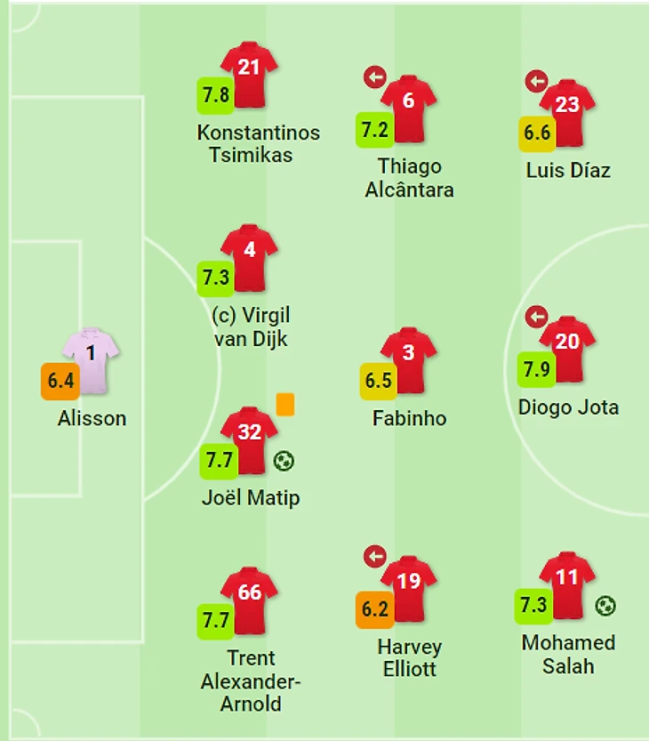 Остальные: Жота − 7, Алиссон, Александер-Арнольд, Ван Дейк − 6,5, Фабиньо, Эллиотт, Нуньес − 6, Фирмино − 5,5, Милнер, Байсетич − б/о.