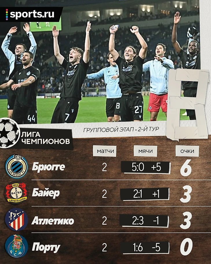 В группе B неожиданная интрига: в прошлом туре «Атлетико» и «Порту» устроили драматичную концовку с тремя голами, а теперь они же синхронно проиграли «Байеру» и «Брюгге» соответственно. Теперь в квартете с 6 очками лидирует клуб из Бельгии.