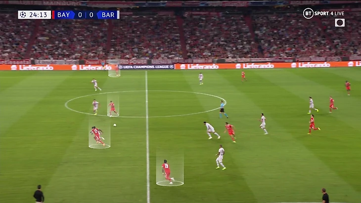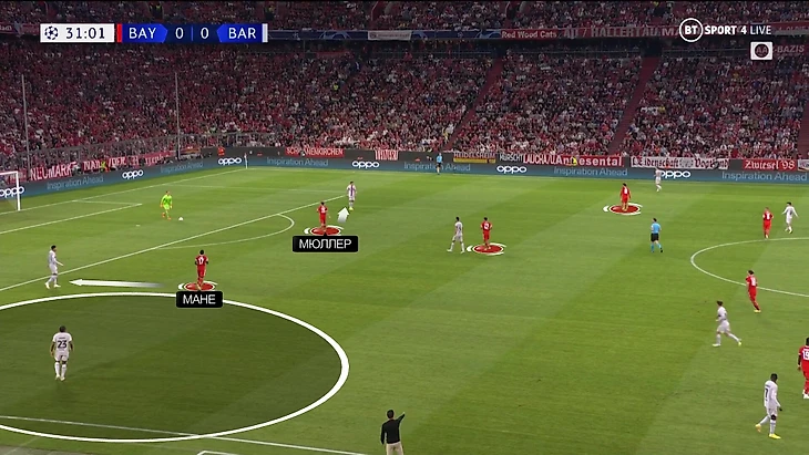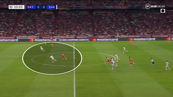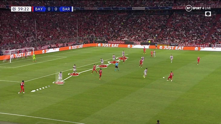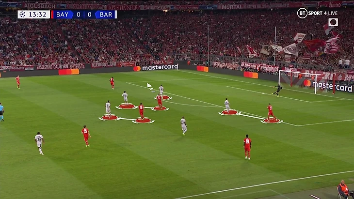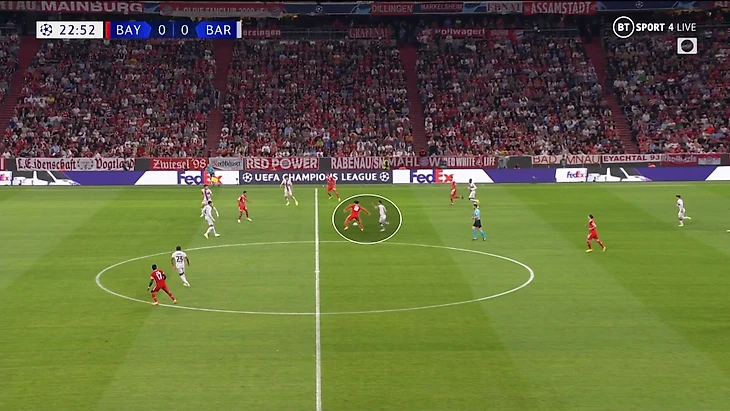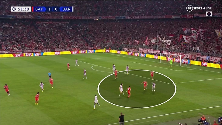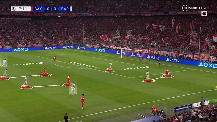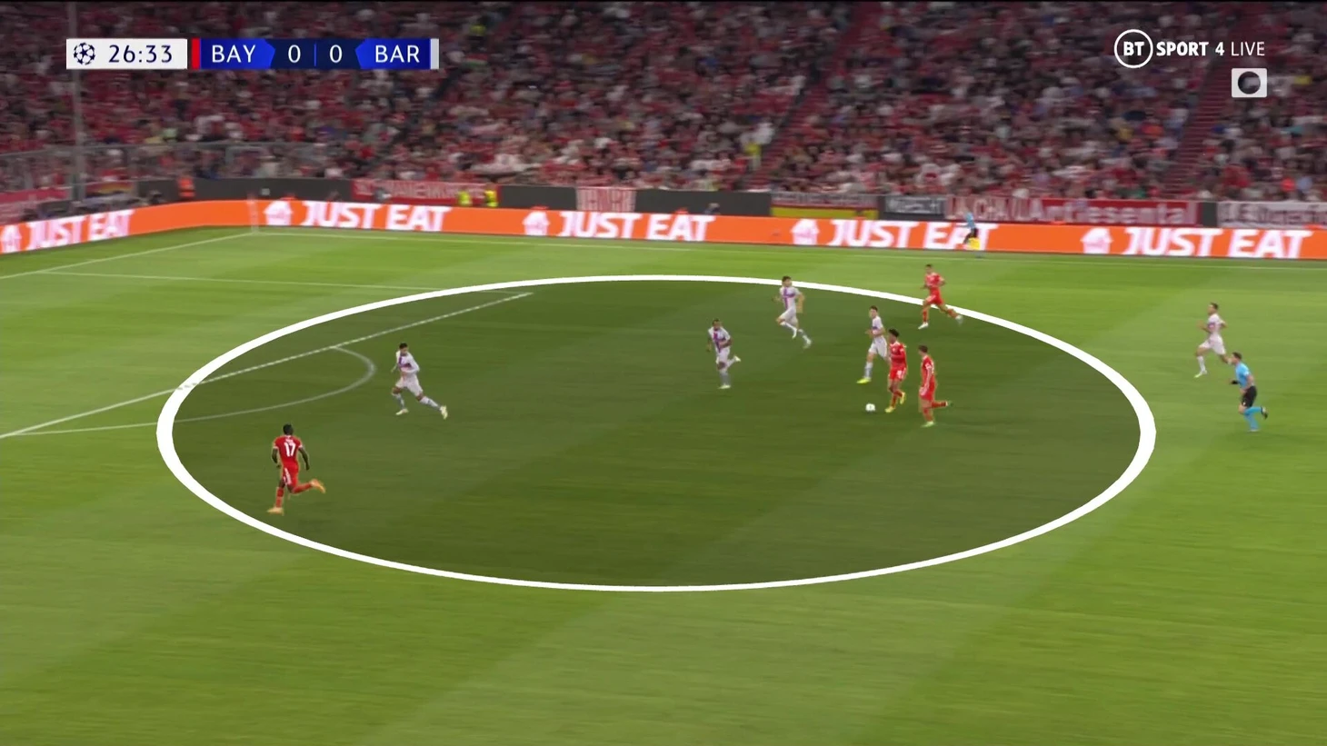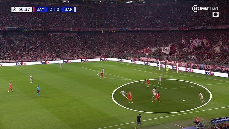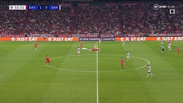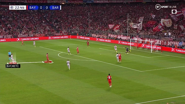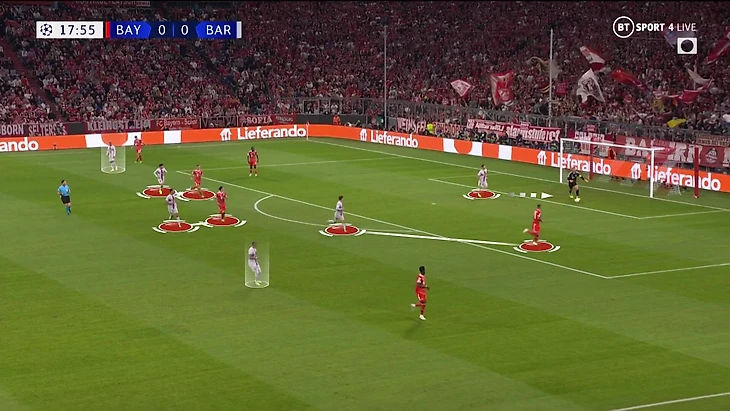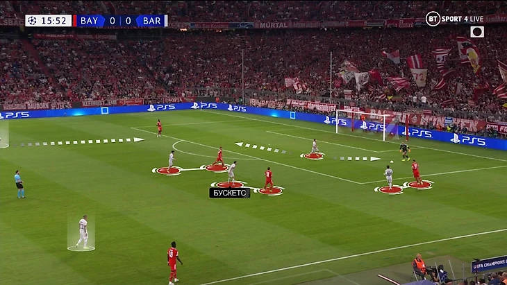 Проще говоря, обе команды хороши в прессинге (вот же сюрприз!), но «Бавария» строила свое давление не так смело, что оставляло «Барсе» постоянную опцию для развития атаки. На практике из-за быстрых смещений «Баварии» получалось не столько развитие (с обострением), сколько контроль. Но это тоже помогало.