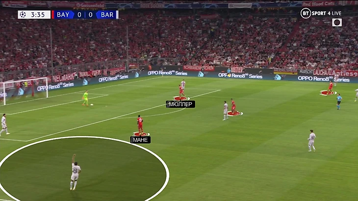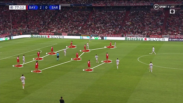 Пиком прессинга стали первые 30-35 минут. В конце первого тайма «Барса» стала чаще садиться в позиционную оборону (иногда даже Дембеле опускался в пятерку за Дэвисом):
