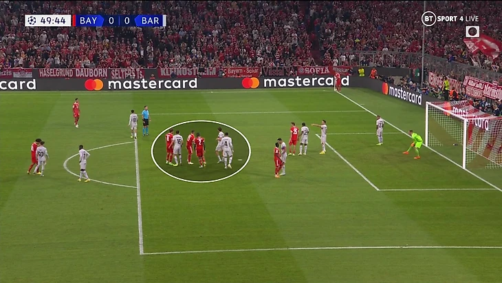 Ухудшилась и игра «Барселоны» в розыгрышах (когда «Бавария» все-таки шла в высокий прессинг). Команда чаще пасовала в ловушку «Баварии» на правом краю поля вместо того, чтобы использовать фланг с более свободным Кунде: