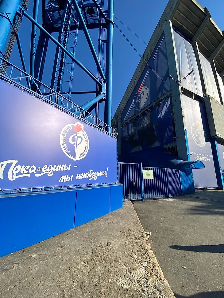 Центральный стадион профсоюзов оказался надёжно спрятан в жилых домах. Если бы не прожекторы, то представить здесь место притяжения жителей практически невозможно. У Центральной трибуны видишь палатки с шаурмой и выпечкой, а вот фаншоп находится в пристройке рядом. Тайну стадиона выдают три двери с табличками: «Вход для команды гостей», «Вход Пресса», «Вход для команды «Факел». Припаркованные автобусы в день матча привлекают внимание и формируют толпу, стремящуюся урвать автографы или поймать футболистов для фото.