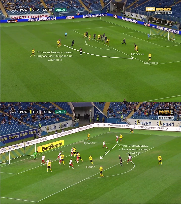 Также «Ростов» использует розыгрыши на третьего. Например, в матче против «Сочи» Осипенко создал ширину (Мелехин блокировал игрока), а со «Спартаком» классно выбежал Полоз.