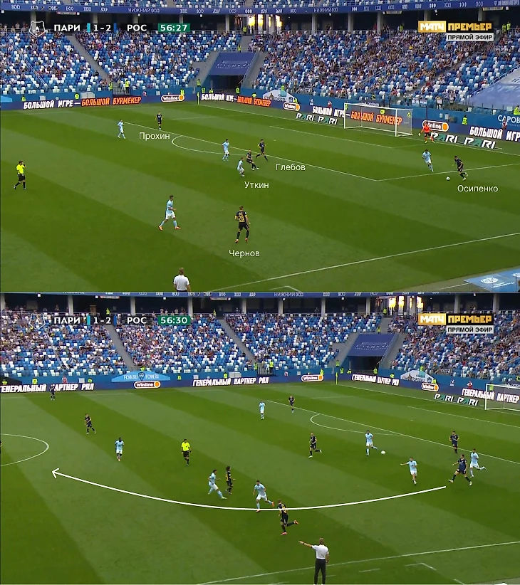 Первый гол «Ростова» с игры был забит именно благодаря активности Осипенко, а также уходу Комличенко в глубину. Осипенко не нашел вариантов для быстрой передачи и сделал несколько шагов вперед, после чего шведой забросил на Комличенко (если бы вели статистику по передачам внешней стороной стопы от центральных защитников, Осипенко точно лидировал).