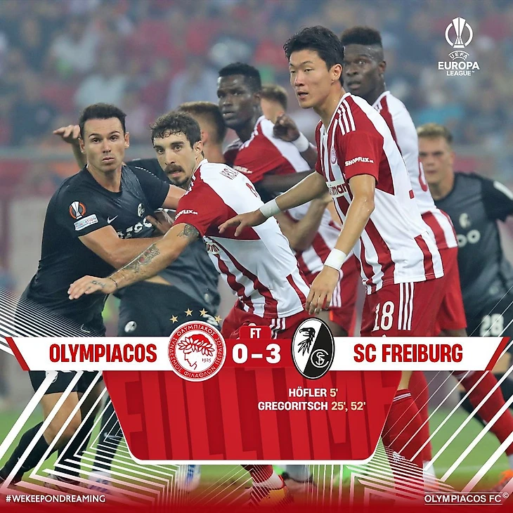 «Фрайбург»: Марк Флеккен, Филипп Линхарт, Килианн Силдиллия (Лукас Кюблер 78′), Маттиас Гинтер, Кристиан Гюнтер, Максимилиан Эггештайн, Николас Хефлер, Винченцо Грифо (Янник Кейтель 78′), Рицу Доан (Нильс Петерсен 69′), Даниэль-Кофи Киере (Чон У Ён 62′), Михаэль Грегорич (Кевин Шаде 62′) Еврокубковый вечер в четверг начался для немецких команд в Греции, на стадионе «Георгиос Караискакис», где местный «Олимпиакос» принимал «Фрайбург».