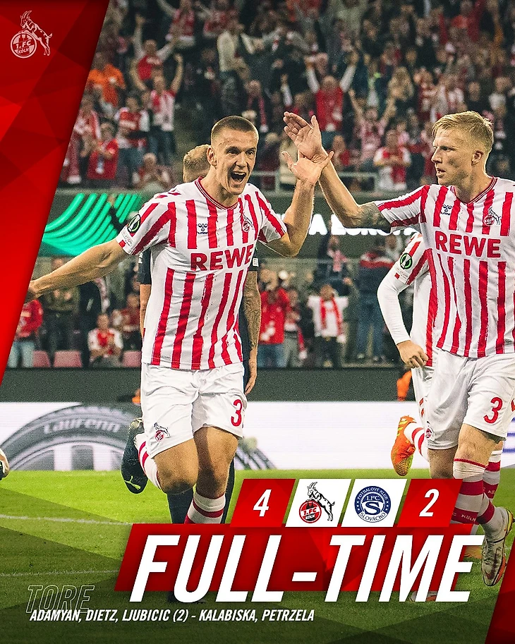 «Словацко»: Томаш Фрыстак, Михал Кадлец, Станислав Хофман, Ян Калабишка, Петр Рейнберк, Михал Травник (Даниель Хольцер 72′), Марек Хавлик, Властимил Даничек (Томаш Брежечка 34′), Милан Петржела (Михал Кохут 84′), Доски Мерхауз (Василий Синявский,72′), Ондржей Мигалик (Либор Козак 84′) Порадовал свою армию поклонников, изголодавшихся по еврокубковым победам, и «Кельн», одолевший чешский «Словацко» в очень веселом матче Лиги Конференций. Первый тайм вышел равным — обе команды огрызались опасными моментами и даже нанесли совершенно одинаковое количество ударов по воротам — семь в целом и три в створ. Однако при всем равенстве статистики к перерыву на табло горел счет 2:0 в пользу «козлов» — здорово сработали на двух угловых ударах Адамян и Дитц.