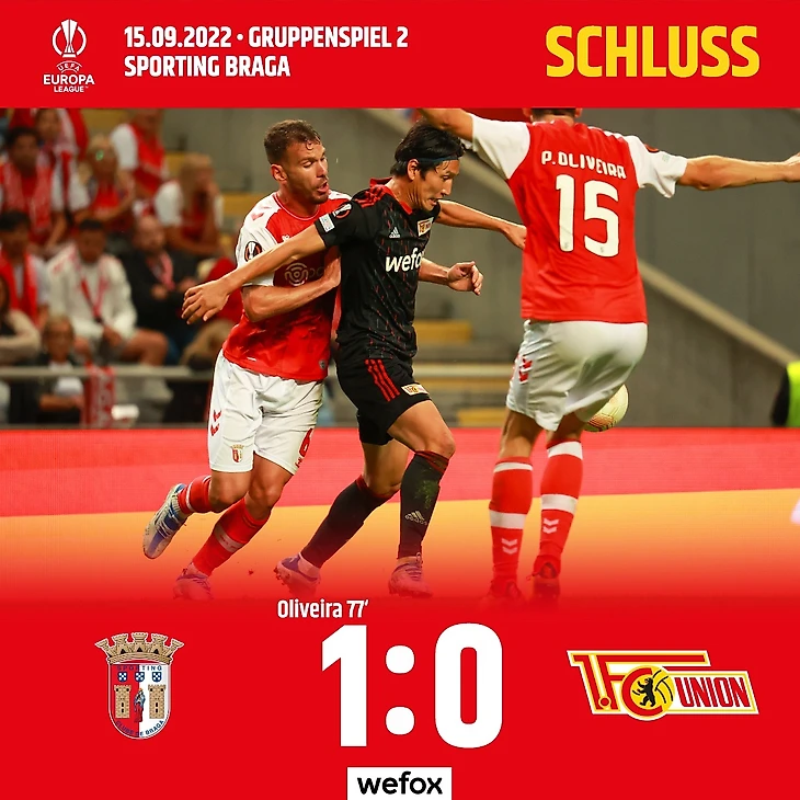 «Унион»: Фредерик Реннов, Пол Джаекел, Диогу Лейте, Юлиан Рюэрсон, Тимотеуш Пухач (Кристофер Триммель 65′), Робин Кнохе (Джейми Левелинг 82′), Рани Хедира, Андраш Шафер (Генки Харагути 68′), Яник Хаберерс (Тим Скарке 82′), Шералдо Беккер (Кевин Беренс 82′), Теозон Сьебатшо Одним из главных матчей прошедшего игрового дня в Лиге Европы стала игра в Португалии. В гости к местной «Браге» приехал действующий лидер немецкой Бундеслиги. Напомним, неделю назад португальцы победили в гостях шведский «Мальме», а «Унион» с минимальным счетом неожиданно проиграл бельгийскому «Юниону» дома. Первый тайм прошел с ожидаемым преимуществом хозяев поля и в самом завершение первого тайма «Брага» имела хорошие шансы выйти вперед. С плотным ударом Симона Банза вратарь гостей Фредерик Реннов справился уверенно и спокойно. Так без забитых мячей команды и ушли на перерыв. Все основные события матча пришлись на вторую половину игры. Норвежский символ «Униона» Юлиан Рюэрсон, проводящий свой пятый сезон за гостей, в начале второго тайма мог вывести немецкую команду вперед, но пробил рядом со штангой после качественной позиционной атаки.