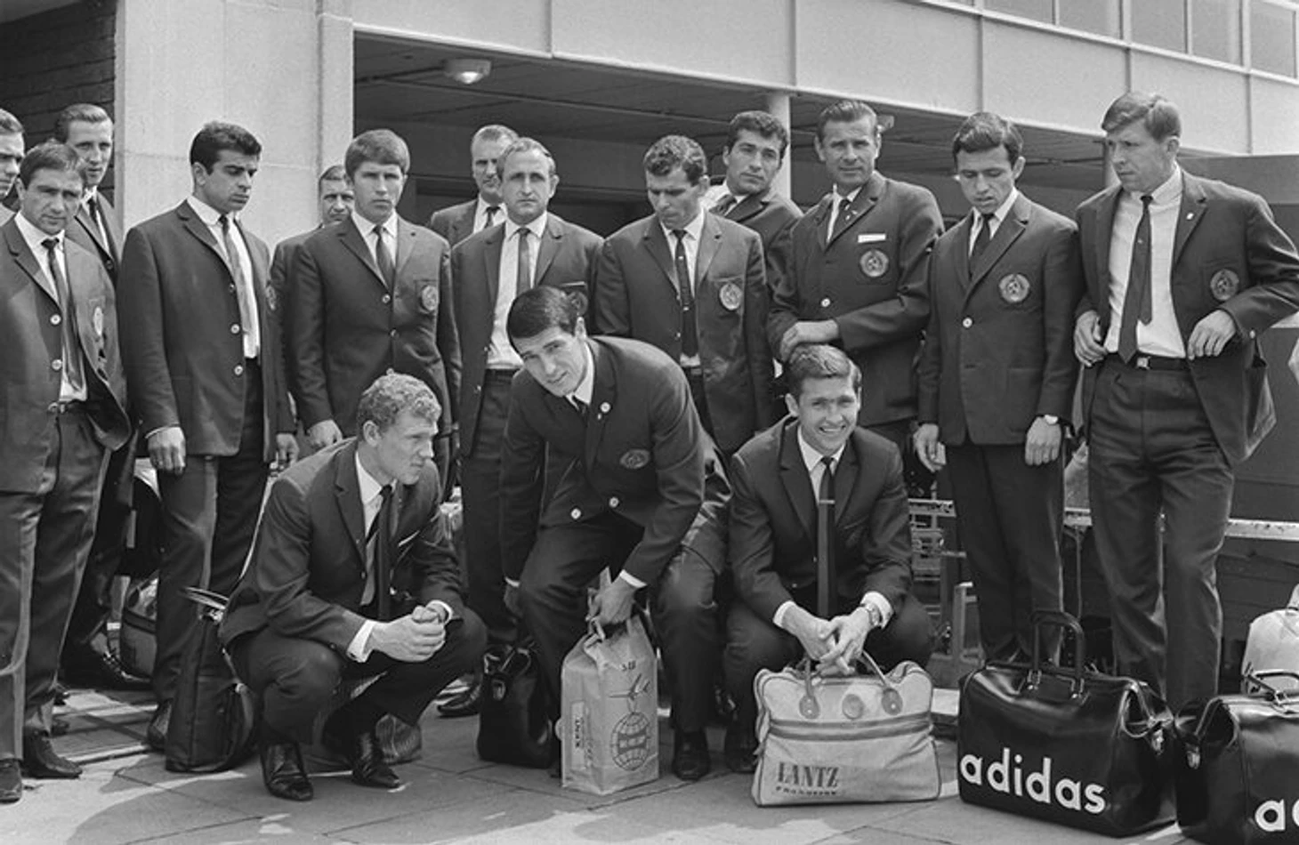 Сборная СССР по футболу во главе с Львом Яшиным (стоит третий справа) готовится к вылету на Кубок мира-1966