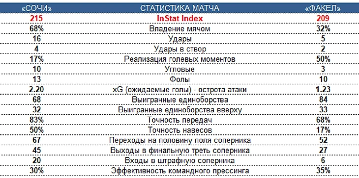 Счёт матча в соответствии с xG (ожидаемыми голами) – 3:1 в пользу «Сочи». Лучший игрок матча по версии эксперта канала Матч-Премьер – Никита Бурмистров. Лучшие игроки матча по версии InStat Index – Кристиан Нобоа (270), Ваня Дркушич (268), Тимофей Маргасов (263).